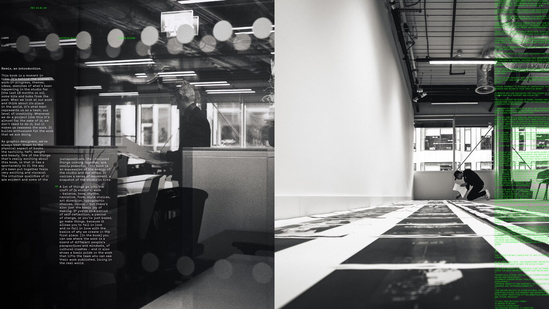 The creation of REMIX grew organically from SuperFutures, DixonBaxi’s ongoing cycle of invention and reflection. The studio generated over a thousand pages of material, then refined it through three full dummies and countless print tests.